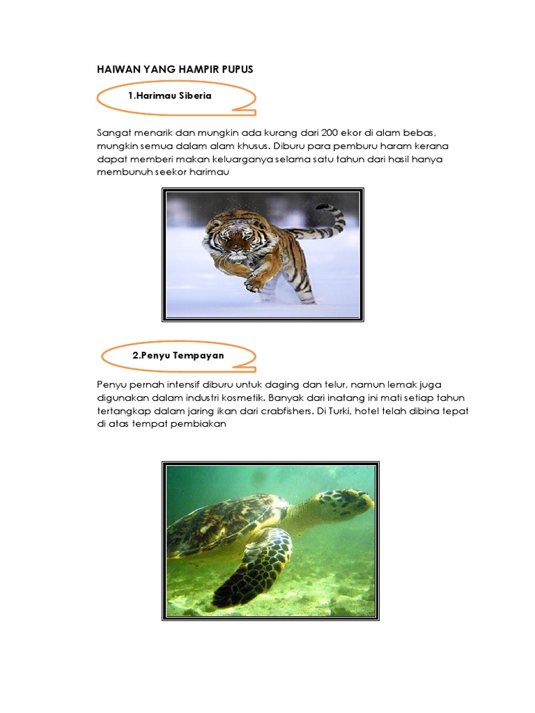 Haiwan dan tumbuhan ini disebut sebagai spesis yang hampir pupus. Spesis yang hampir pupus 1. Disebabkan pembangunan di negara mereka yang sangat maju secara tak langsung hidupan hutan pun banyak yang pupus sebab penerokaan hutan secara berleluasa.